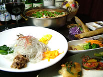 ▼サムギョプサル(韓式焼肉) ・熟成牛タン ・トントロ ・豚三枚肉 ・骨付きカルビ ・包み野菜 ・白菜キムチ ・韓国串おでん ・本日のサラダ ・ニラ豚ちぢみ ・ピリ辛手羽天神揚 ・参鶏湯(サムゲタン) ・デザート |